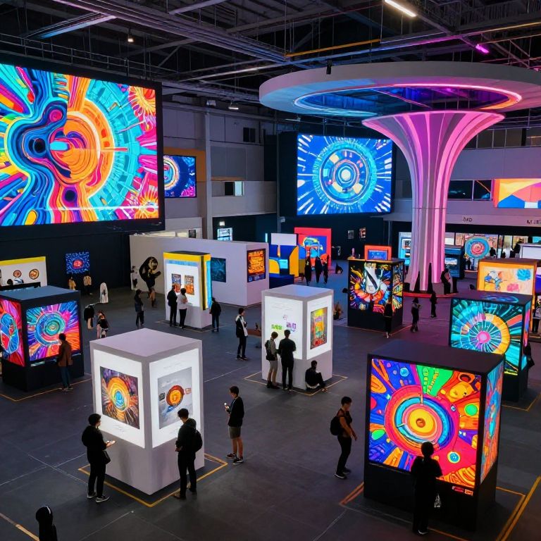 Vibrant digital art exhibition with glowing, colorful abstract displays; people viewing illuminated cubes and large screens in a modern warehouse space.
