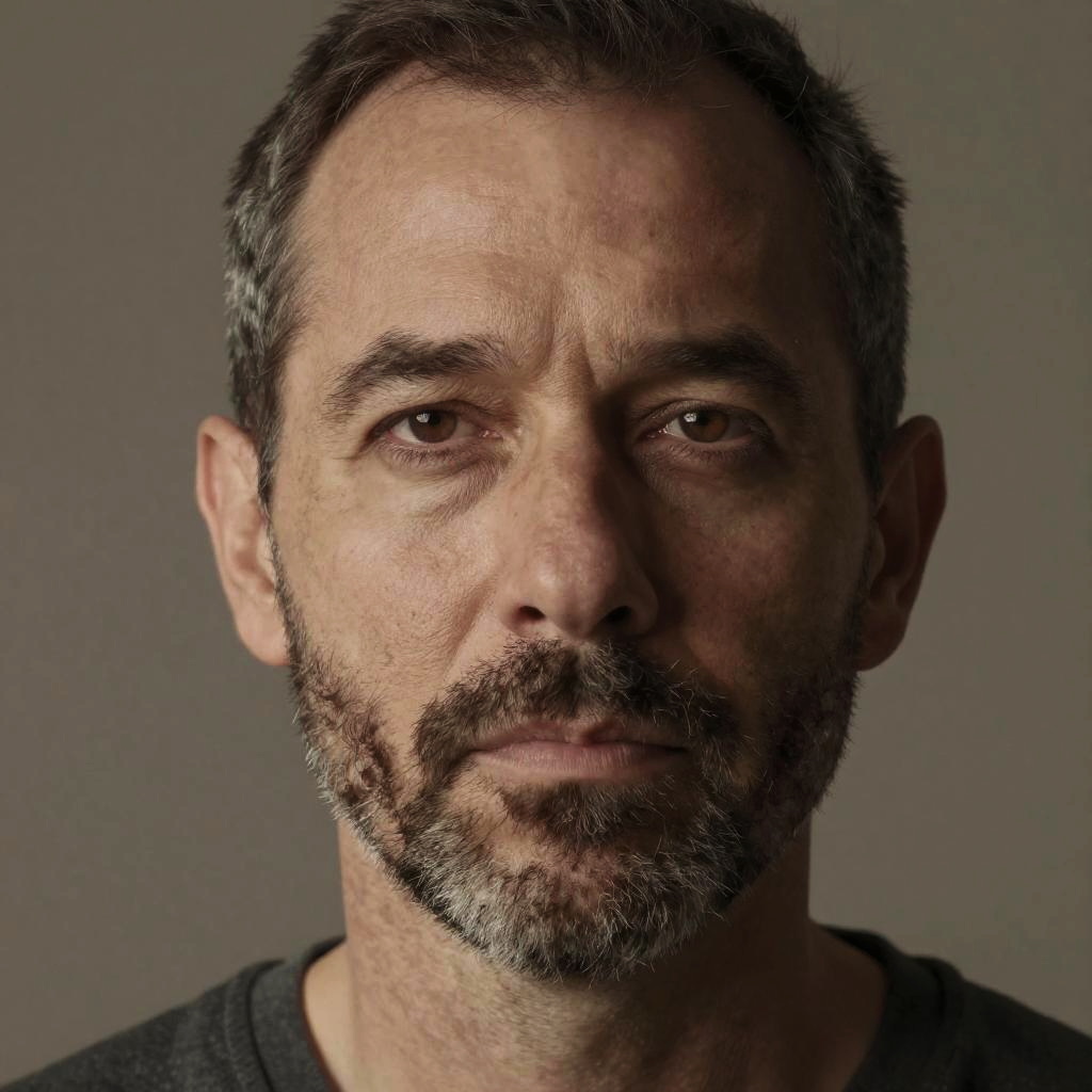 40 year old man face, middle-aged with peppered beard and thoughtful eyes, studio shot, realistic details with soft shadows, warm ambient light, textured skin