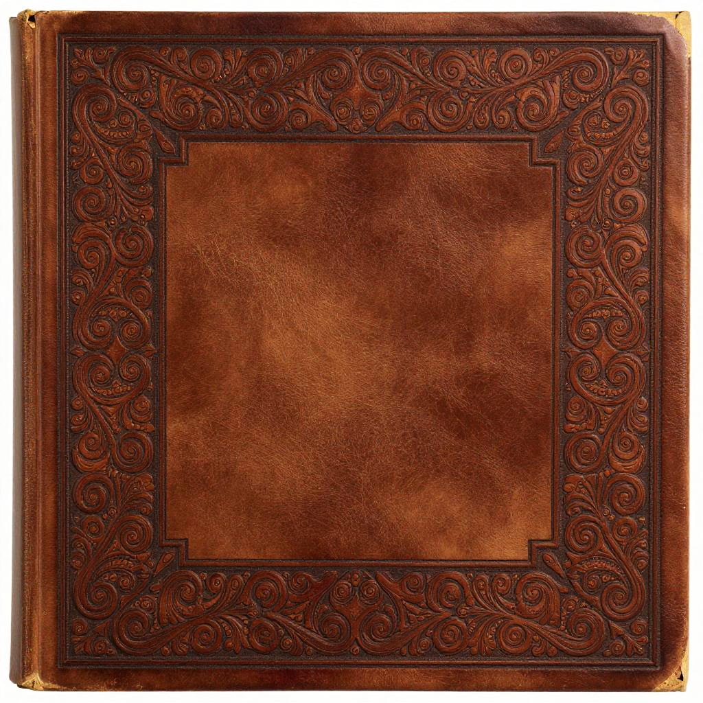 Scrollwork border on a classical book cover, elaborate and symmetrical arabesque patterns, warm bronze and crimson colors, antique style, embossed leather texture, intricate craftsmanship