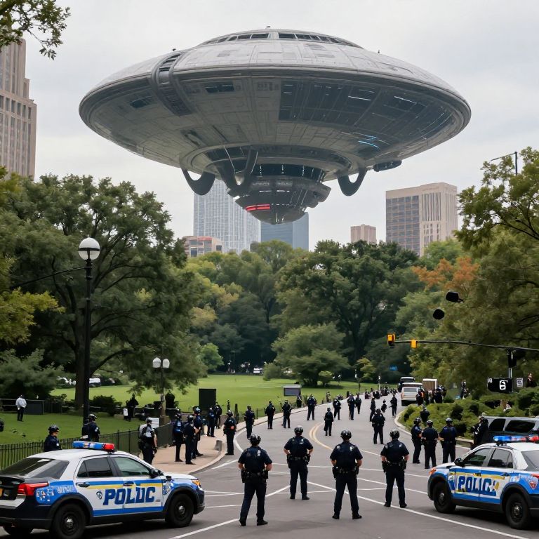 Cybernetic Implant a large alien spaceship hovering above Central Park. Dozens of NYPD police officers are trying to clear the area.,