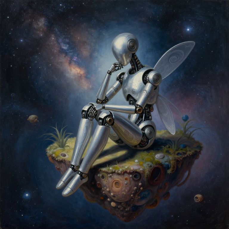 A futuristic oil painting depicting a surreal scene from an insect-like perspective, featuring a sleek, silver robot pensively seated on a floating island amidst a vast, starry expanse. The robot's metallic form is intricately detailed with swirling patterns and organic shapes reminiscent of surrealist artistry, casting dramatic shadows against the cosmic backdrop under soft, ethereal light from the stars. This captivating, dream-like landscape evokes a sense of awe, mystery, and introspection as the viewer delves into its enchanting depths.