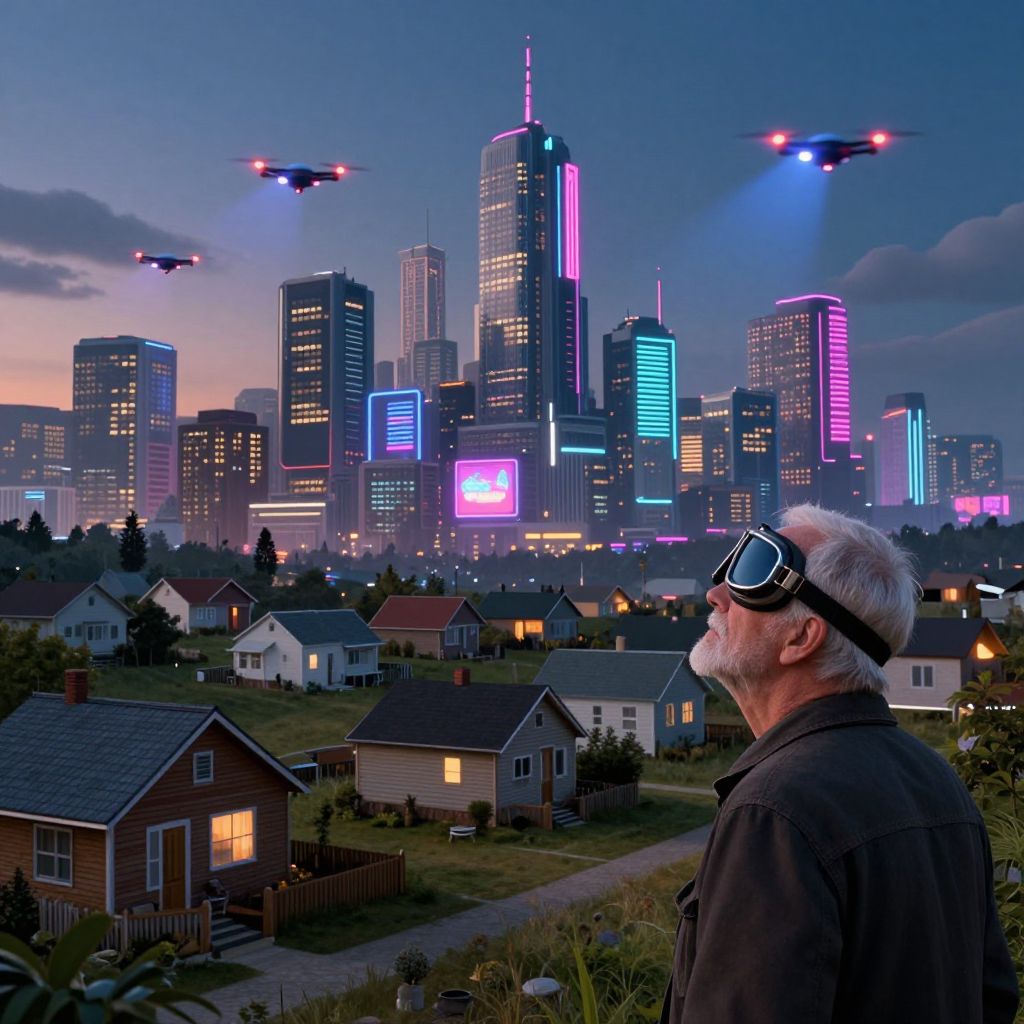 An ethereal cityscape bathed in twilight hues, evoking a dreamlike ambiance akin to Chagall's whimsical paintings. This futuristic metropolis teems with life as sleek, intricately designed flying machines traverse the neon-drenched sky, casting an enigmatic glow over the scene. From above, witness an aged woman suspended in midair, her arms outstretched revealing iridescent wings that harmonize with the pulsating lights of the city's veins below. This evocative tableau beautifully juxtaposes human innovation against a backdrop of natural wonder, stirring feelings of awe and longing for a future where technology and magic intertwine to form an extraordinary spectacle.