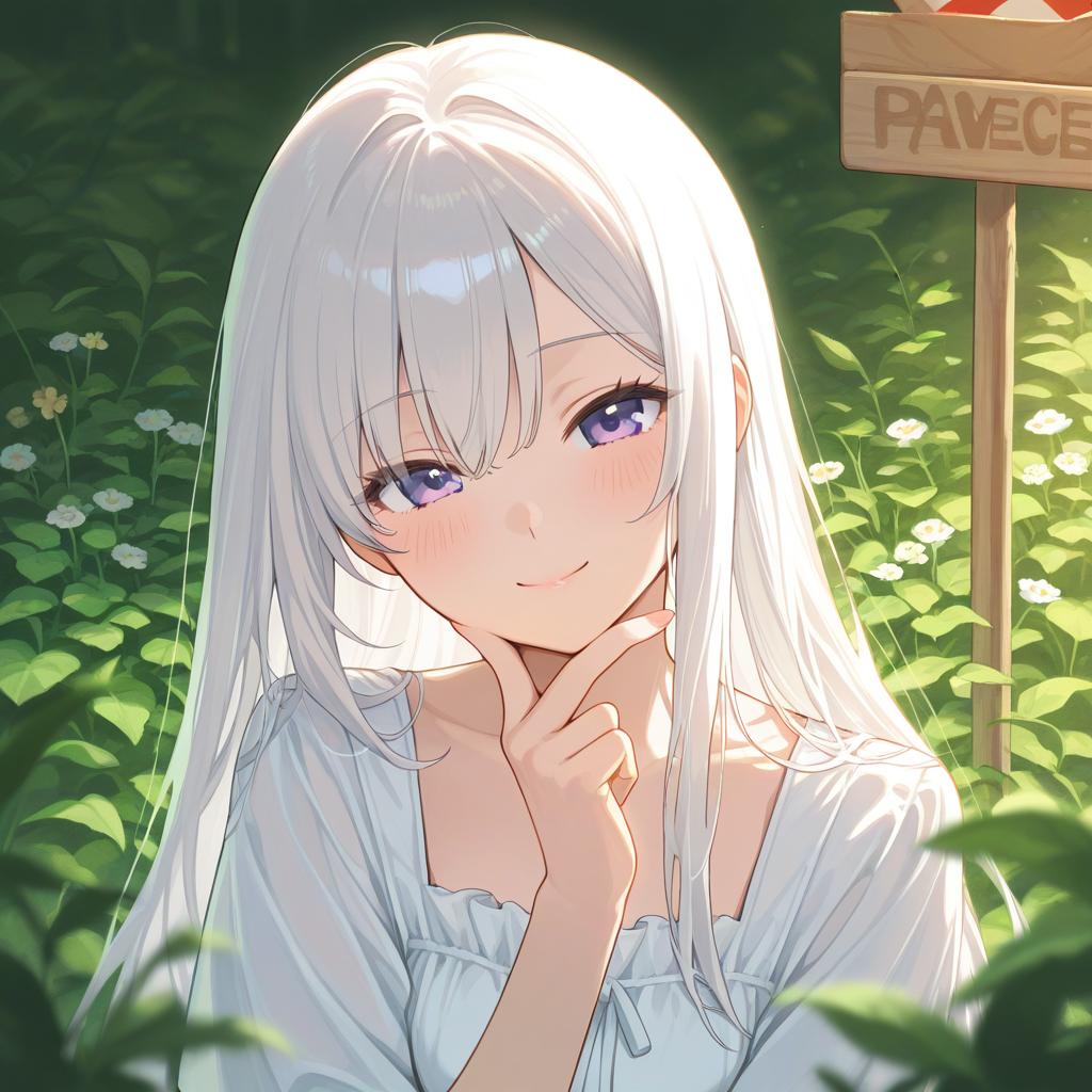 Peace, sign, smile, upper body portrait, (masterpiece, best quality), 1girl with long white hair sitting in a field of green plants and flowers, her hand under her chin, warm lighting, white dress, blurry foreground