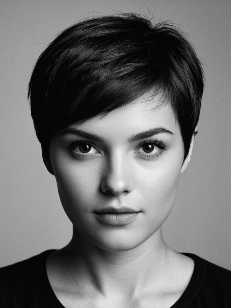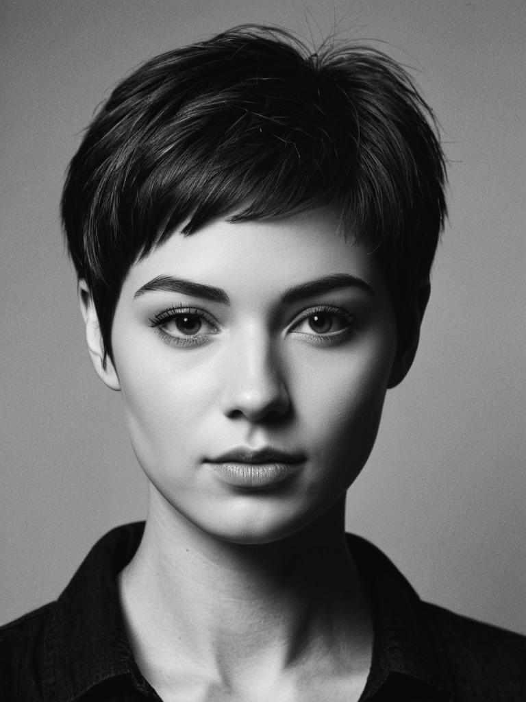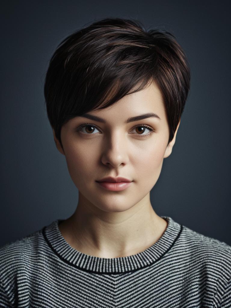 Woman with Dark Brown Pixie Cut, photorealistic detailed studio portrait