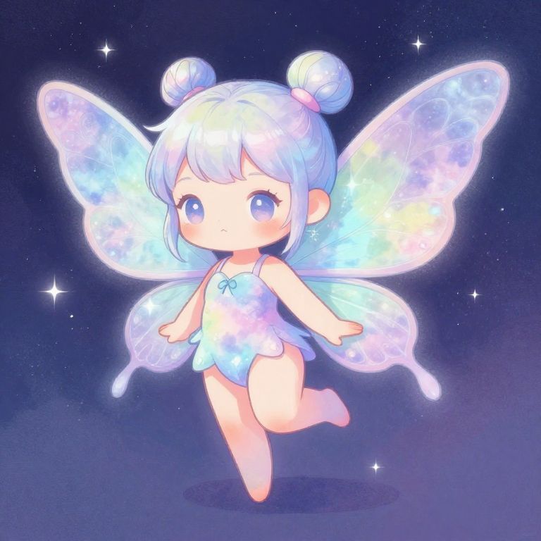 Gilded a female fairy, pixie, entire body, cute and little, chibi, kawaii, soft colours, galaxy colours, tie dye, pale, drawing and painting style,