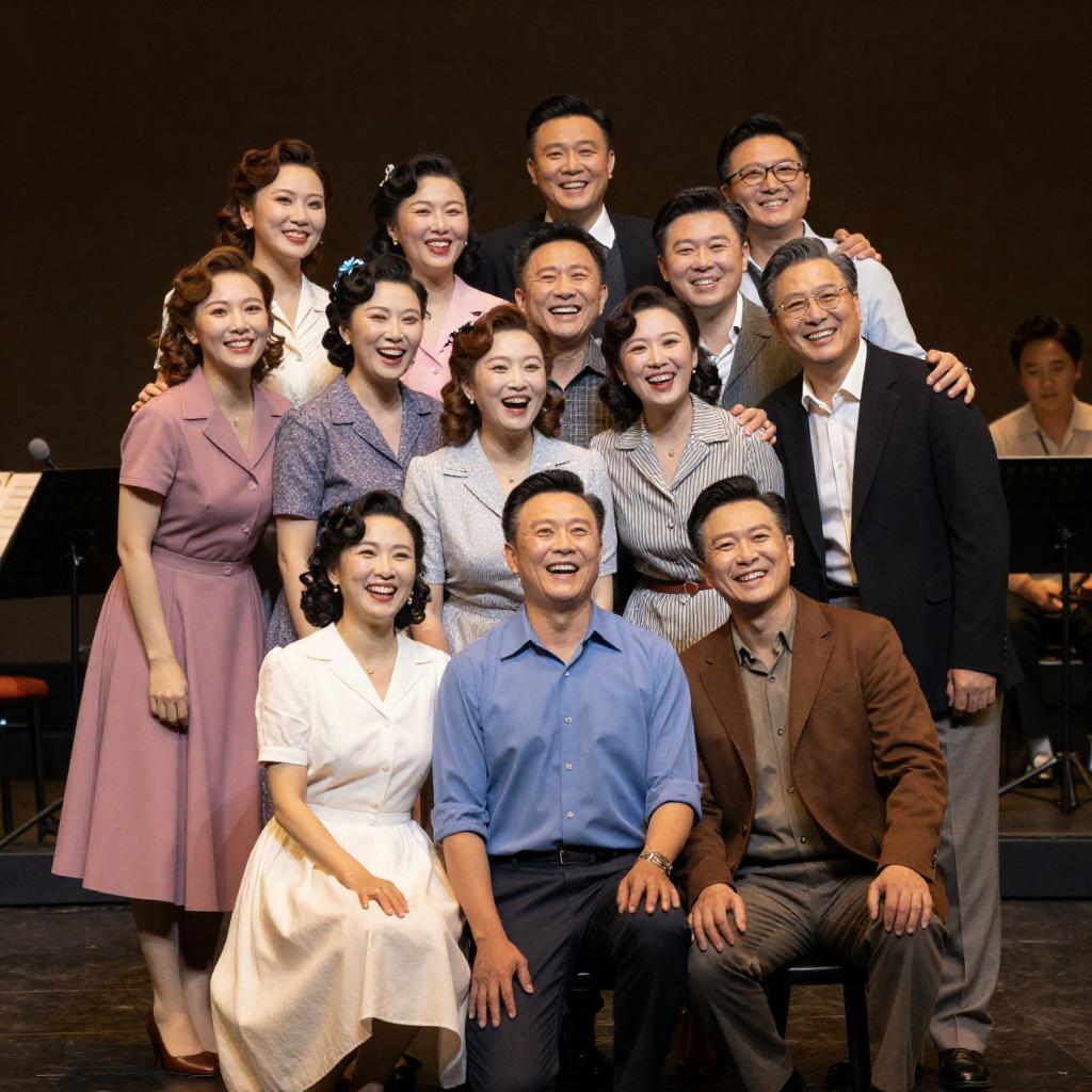 Photograph of a theater cast on stage. 15 people, diverse ages, dressed in 1940s-style clothing, smiling and laughing. Front row: woman in white dress, man in blue shirt, man in brown jacket. Back row: woman in pink dress, man in black suit. Various hairstyles: curly, straight, and pinned-up. Background: dimly lit stage with musical instruments. Some people holding microphones. Group hugs and arm around each other. Intense and joyful facial expressions.