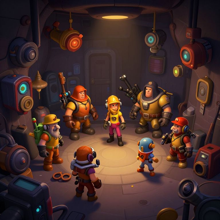 This digital artwork depicts a cartoon-style sci-fi scene in a dimly lit, industrial room with a circular spotlight on the floor. At the center, a blonde girl in a yellow helmet and red shirt stands confidently. Surrounding her are six diverse, armored characters: two with orange helmets, one with a green backpack, one with a large gun, one with a blue helmet, and one with a red helmet. Each character wears various colored uniforms and helmets. The background features hanging lights and metallic walls with buttons and dials. The scene is vibrant with warm and cool colors, emphasizing the futuristic, adventurous atmosphere.