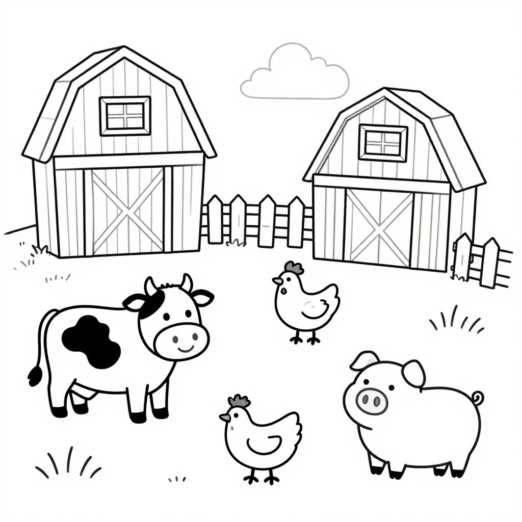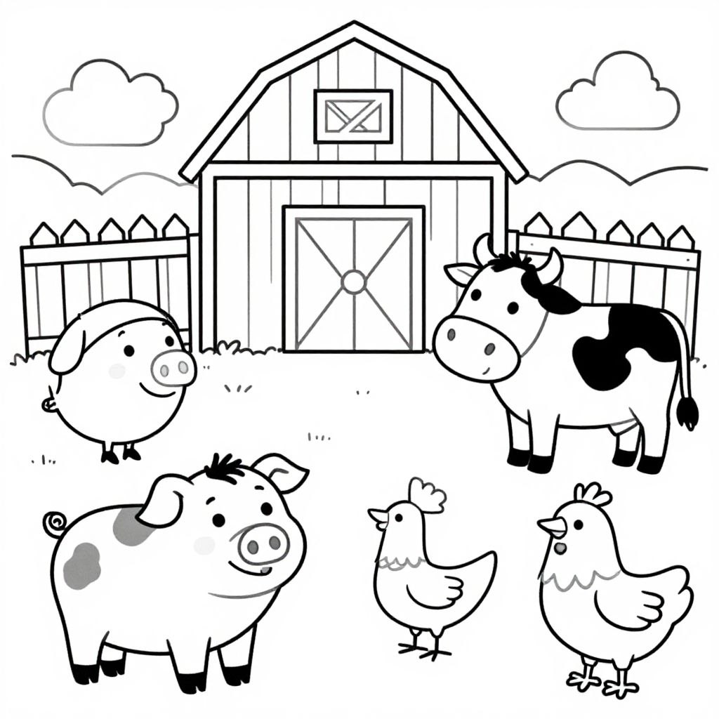 Easy cartoon coloring pages presenting a cozy farmyard setting with easy-to-color farm animals like cows, chickens, and pigs, basic shapes and smiles on characters, surrounded by barns and fences, perfect for early childhood coloring activities.