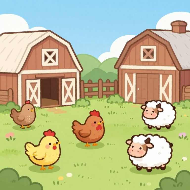 Black-and-white cartoon drawing of a farm with two barns, a black-and-white cow, three chickens, and a pig. Simple, playful lines