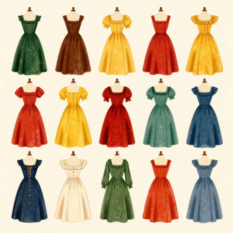 A digital illustration features a grid of 16 vintage-style dresses displayed on mannequin torsos. The dresses vary in color, including green, brown, yellow, red, blue, and white, with different patterns and textures. Styles range from puffed sleeves to square necklines, and some have intricate floral designs. The dresses are arranged in four rows and four columns against a plain white background, highlighting their vibrant colors and classic designs. Each mannequin torso is simple and black, emphasizing the dresses. The overall style is reminiscent of 19th-century fashion.