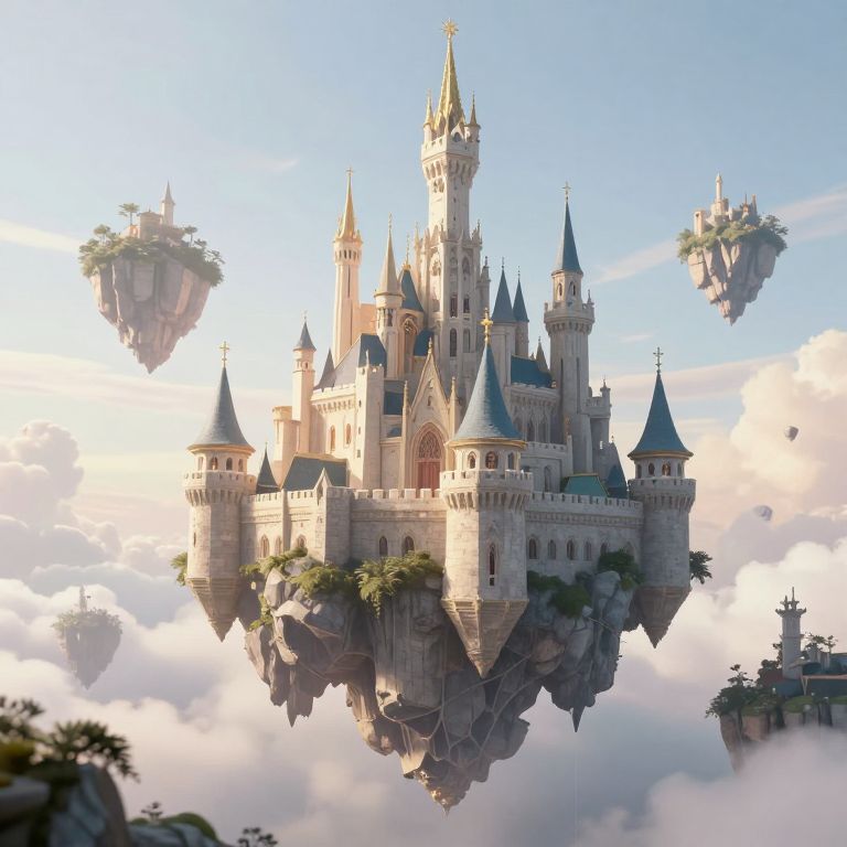 Fantastical CGI castle floating among clouds, surrounded by smaller island-castles with greenery, under a bright blue sky. Detailed architecture and whims