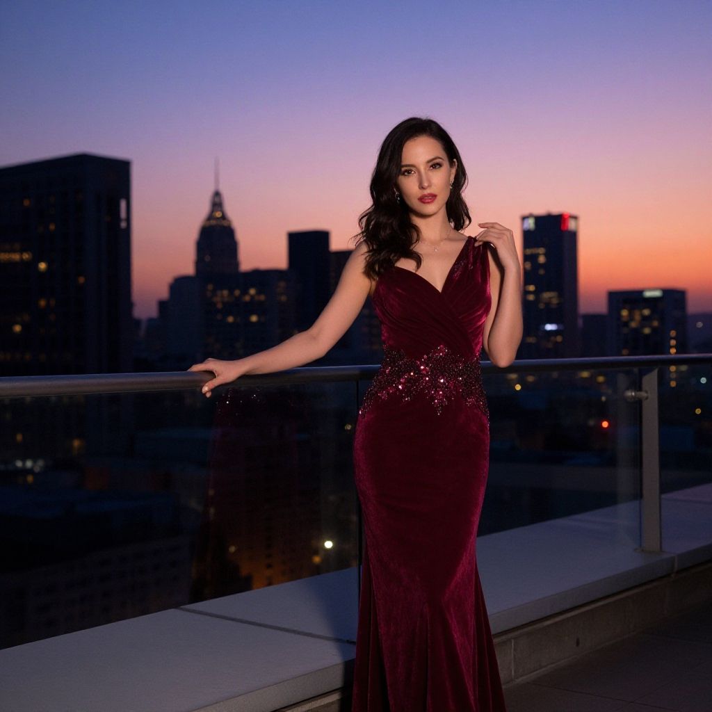 A glamorous woman in a deep red velvet gown poses elegantly on a rooftop terrace, overlooking a stunning city skyline at dusk. The intricate beading around her waist sparkles against the vibrant backdrop of a twilight sky, enhanced by the silhouettes of towering buildings and the glow of city lights.