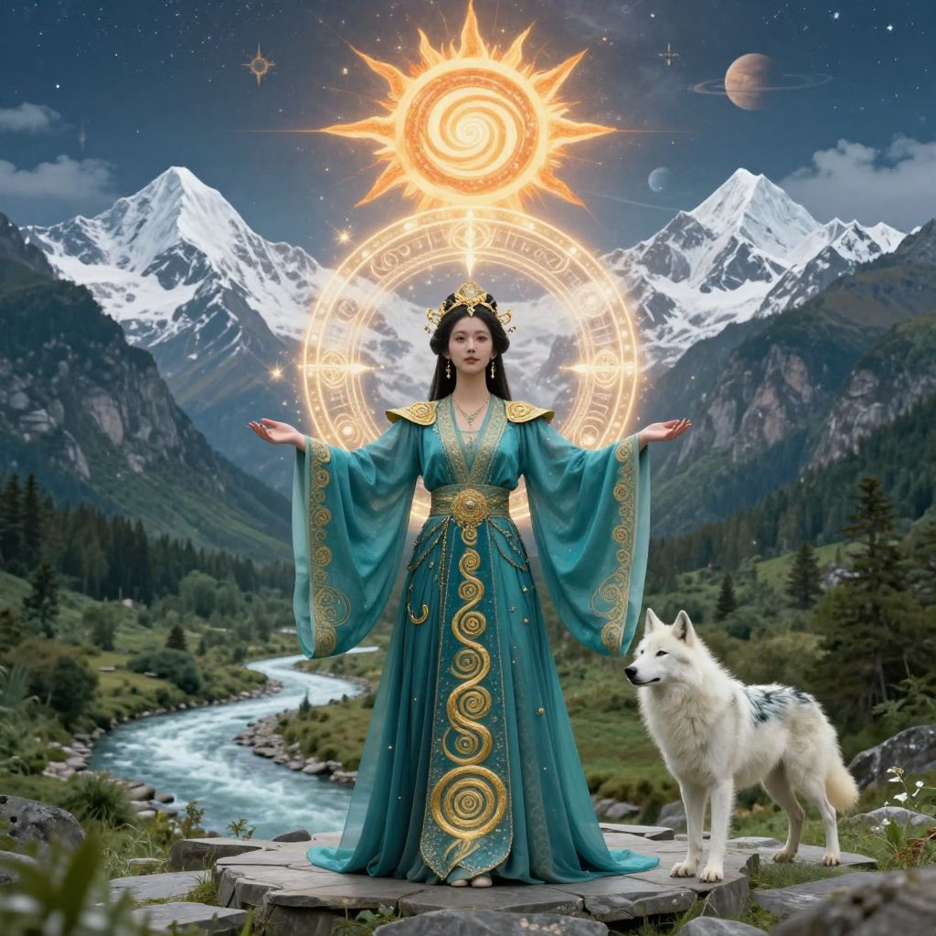 A mystical sorceress dressed in an elaborate teal robe decorated with golden spirals, standing on a stone platform with arms open. Behind her is a glowing magical circle with intricate symbols. The scene is set in a lush mountain valley with a winding river, towering snow-capped peaks, and a white wolf nearby. The sky features a large radiant spiral sun and distant planets, enhancing the magical atmosphere.