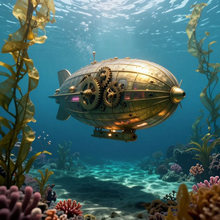 A captivating digital artwork showcases the enchanting amalgamation of an airship adorned with brass elements gracefully soaring through a vibrant kelp forest beneath the waves. From above, witness the intricate gears and propellers intertwined with glowing coral, symbolizing the harmonious marriage of technology and nature. The ethereal light emanating from within the ship casts elongated shadows that gracefully dance upon the undulating seabed, evoking a sense of awe and curiosity as it invites viewers to contemplate the intriguing coexistence between these two distinct realms.