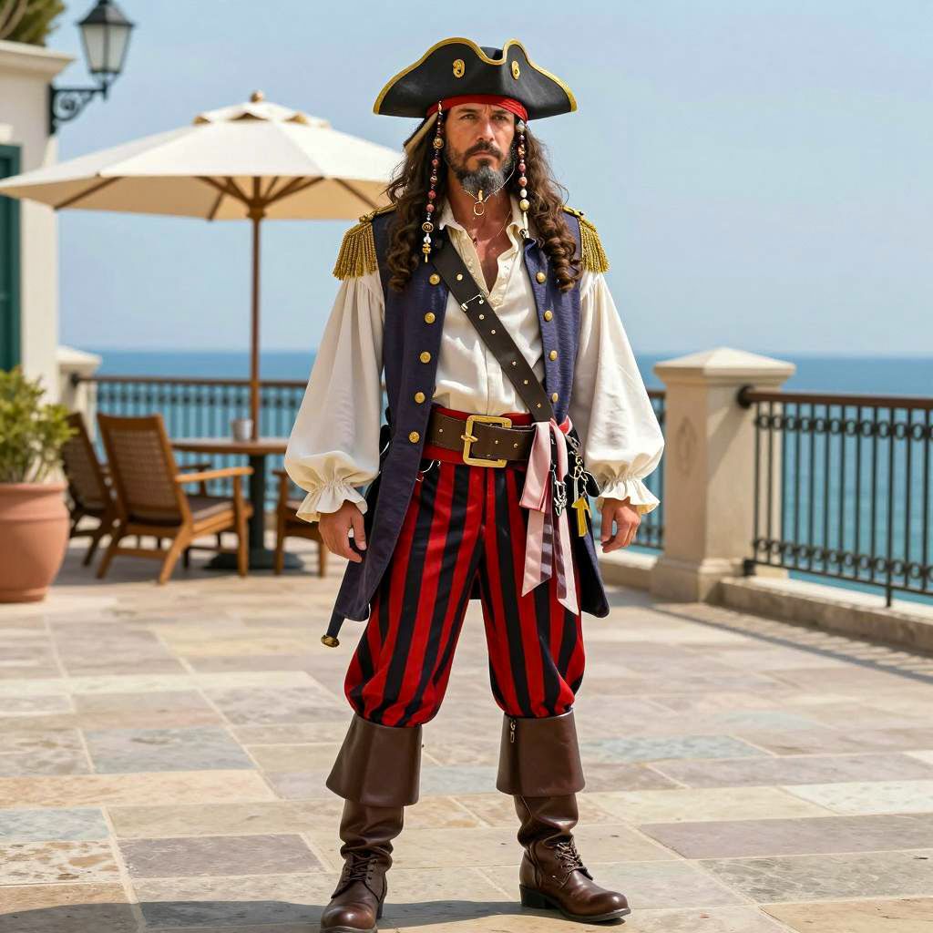 Party costume theme adult, photograph, full-body shot of a man, standing outdoors, sunny day, wearing colorful 19th-century cowboy outfit, red leather pants, orange shirt, black belt with large buckle, black boots with laces, long red coat with white lace trim, tall black hat with red band and star, brown dreads, beard, sunglasses, green leafy background, potted plants on the left, blurred person in white shirt on the right, daytime, vibrant colors, festive, historical costume, detailed outfit, sunny lighting
