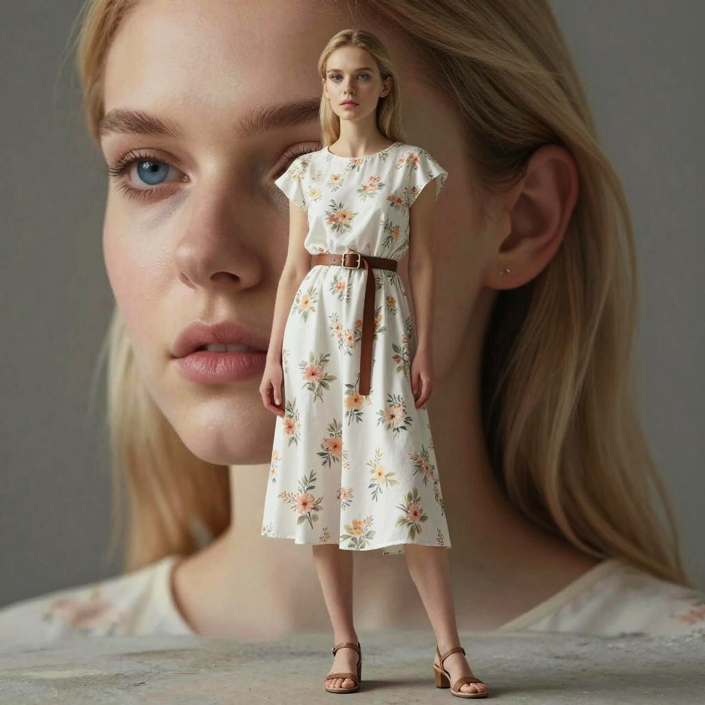 A photograph of a standing, blonde Caucasian woman with blue eyes, wearing a white floral dress with short sleeves and a brown belt, paired with brown sandals. Her straight hair falls to her shoulders. She stands against a blurred, enlarged close-up of her face, which occupies the background. The background is a neutral grey, and the woman's dress features a delicate floral pattern in pink and green. Her expression is neutral, and the lighting is soft, highlighting her fair skin. The image emphasizes the dress and her poised stance.