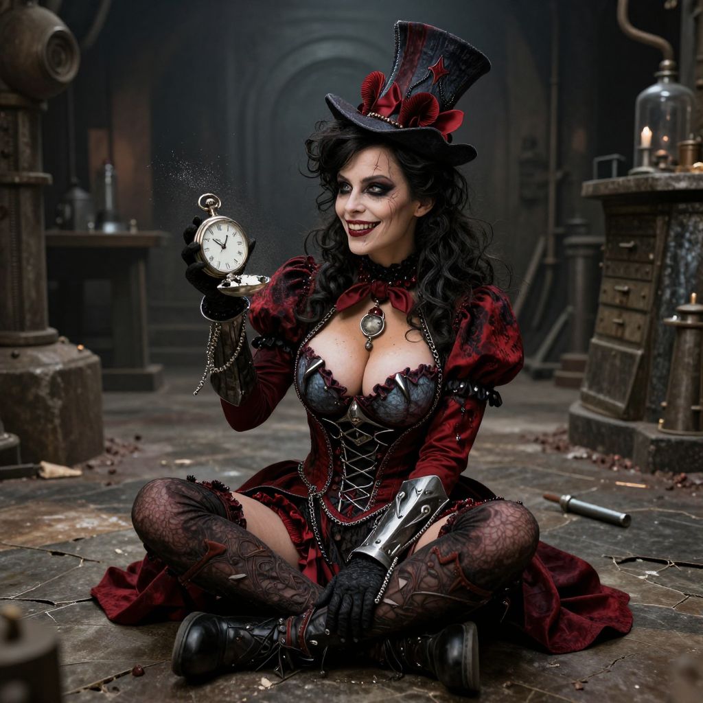A dark mad hatter woman dressed in a vintage-inspired, blood-red and obsidian hatter costume with silver chains and sharp, angular details, sitting cross-legged on a cracked stone floor of a forgotten underground laboratory, her face marked with deep lines and a twisted smile, holding a broken pocket watch filled with glowing dust, atmospheric lighting, hyper-detailed realism. The woman has big breasts and cute face