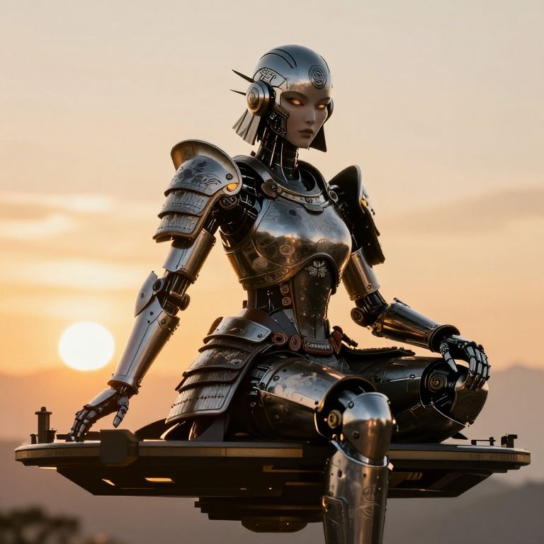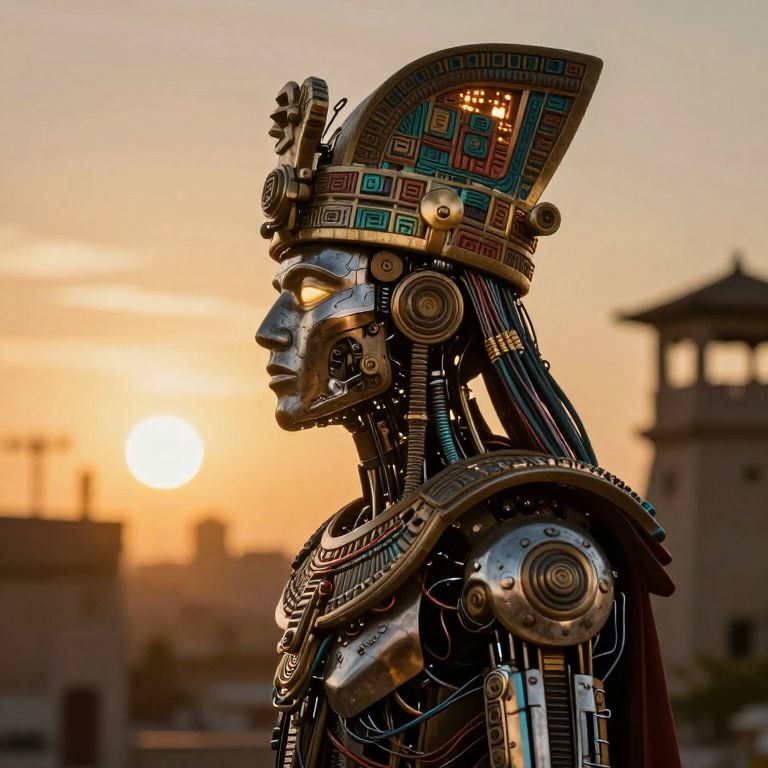 Photograph of a detailed, robotic Aztec warrior in profile, illuminated by sunset. The robot features intricate patterns, metallic textures, and a ceremonial he