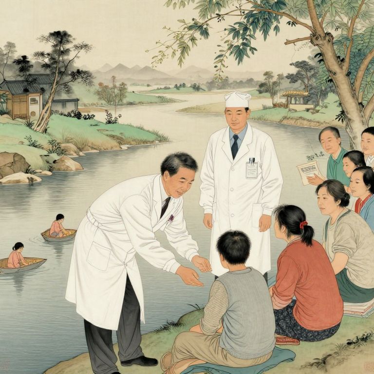 Traditional Asian watercolor painting of a village scene: two male doctors in white coats vaccinating children by a river, surrounded by villagers and people in small