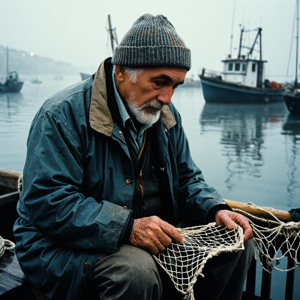 Kodak Portra cinematic film still of a elderly fisherman with calloused hands, wearing a faded raincoat and a knit beanie, mending nets by a foggy harbor at dawn, moody and atmospheric vibe.