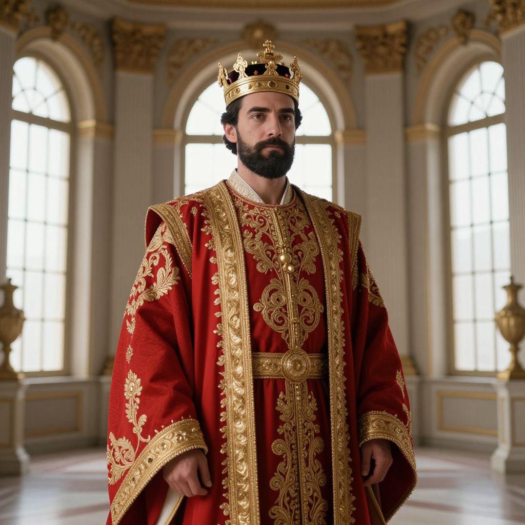 A regal and imposing man, with a commanding presence and a neatly trimmed beard, wearing an opulent red robe adorned with intricate gold embroidery and a majestic crown on his head. He is standing confidently in a grand room featuring ornate, arched windows that let in soft, diffused light.