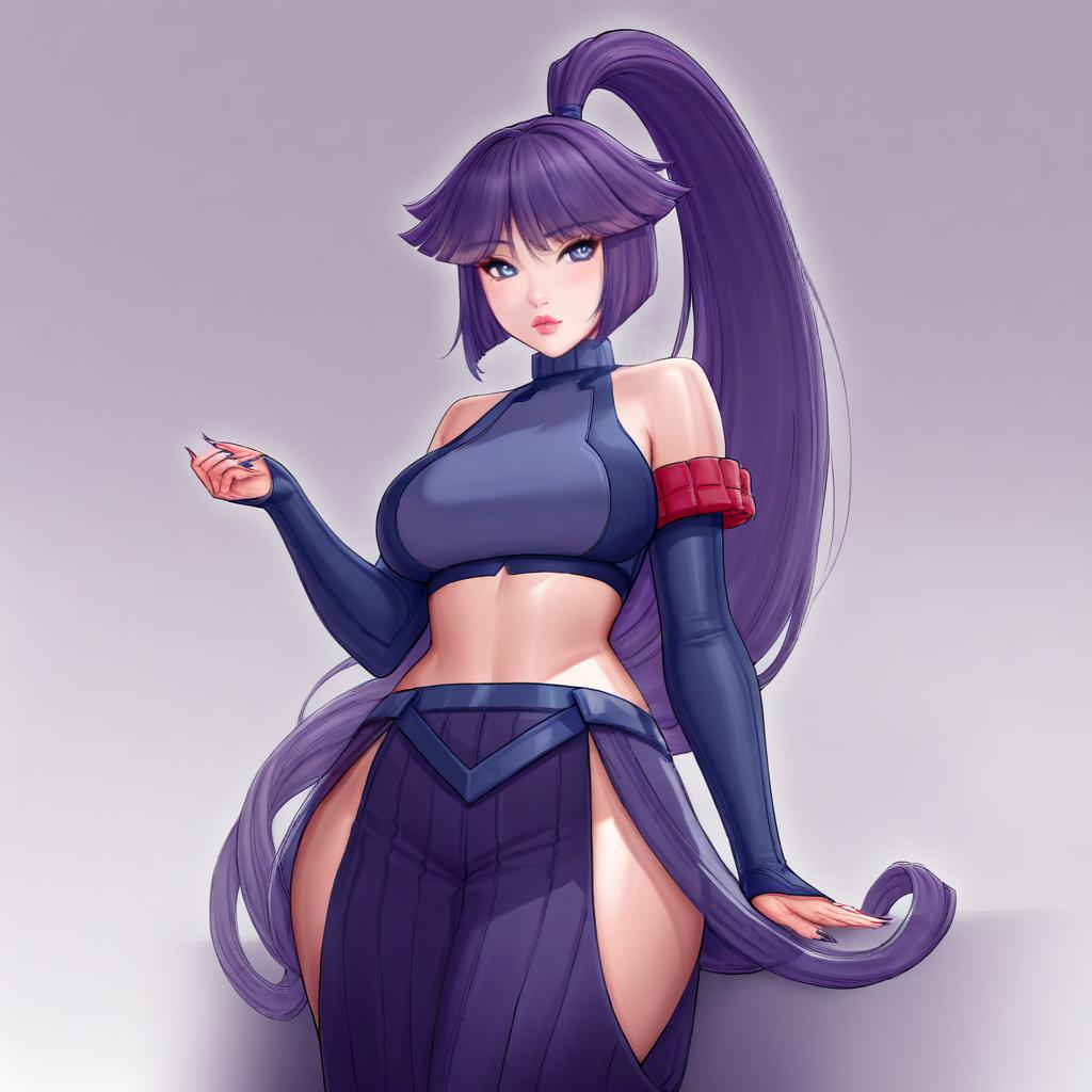 Digital illustration of an anime-style female character with long purple hair styled in a high ponytail. She has purple eyes and is dressed in a dark blue halter top and matching detached sleeves. The outfit includes a high-waisted skirt with large side slits and a red arm band. The artwork is detailed with smooth shading and highlights, depicting a confident and stylish young woman.