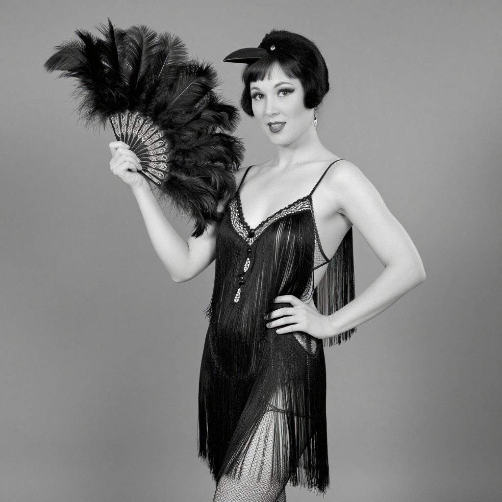 Black-and-white photograph of a confident woman in a fringed, black, 1920s-style lingerie dress, holding a feather fan, wearing a
