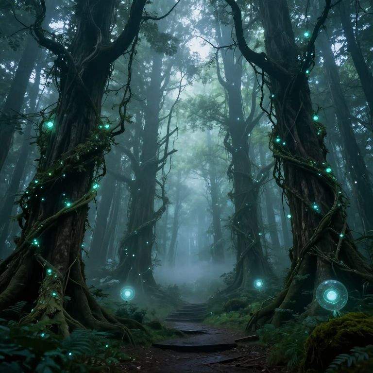 Kv ancient mystical forest with towering trees entwined with glowing bioluminescent vines, serene mist hovering above the ground, and mysterious floating orbs illuminating hidden pathways, evoking a magical and otherworldly atmosphere