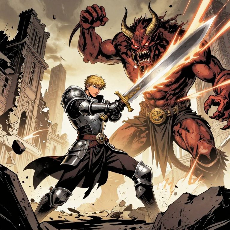 Intricately Designed dvd screengrab from 1990s anime (berserk) (dark souls), a young handsome 18 year old white haired knight wearing a leather cloak is fist fighting a demon knight,