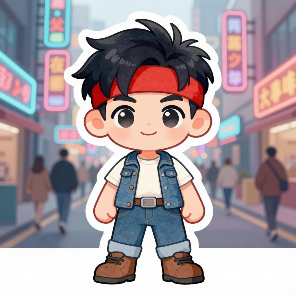 Watercolor anime full-body sticker of young Asian boy with spiky black hair and red headband wearing denim jeans and boots in bustling city street with neon signs, white background, transparent PNG, neon highlights, upscaled, big sparkling eyes, cute smiling face