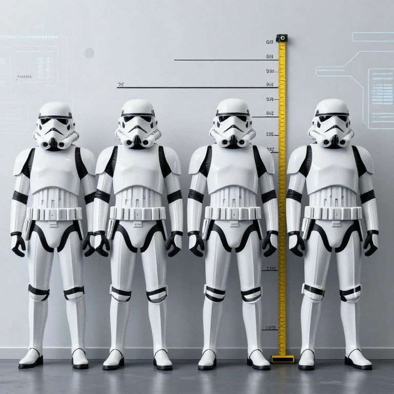 Group of stormtroopers lined up next to a measuring tape, showing exact heights in a clean, minimalist sci-fi setting, focus on armor detail and scale, soft lighting with a futuristic digital interface background.
