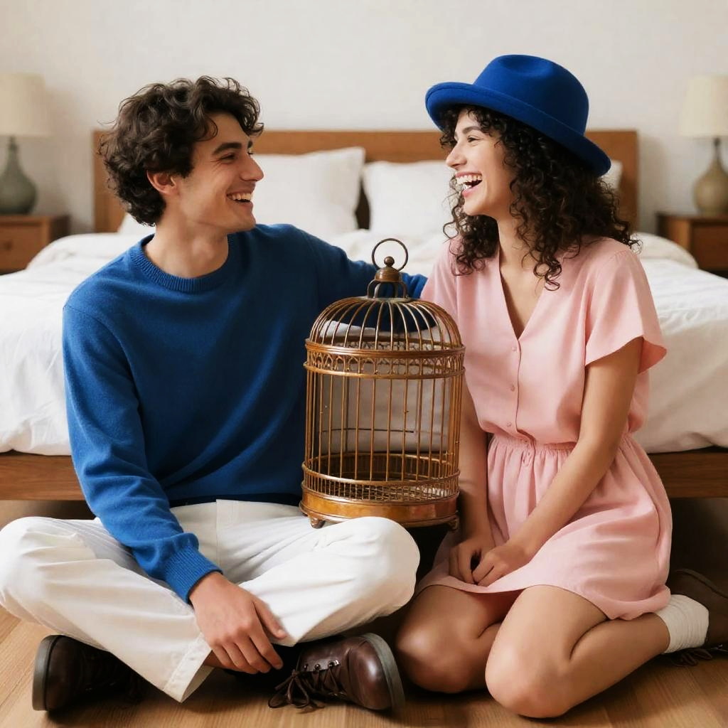 Photograph of two people sitting on the floor. Man in blue sweater and white pants, woman in pink dress and blue hat. Both laughing. Birdcage between them. Man leaning back, woman kneeling. Bed in background. Both smiling. Man's dark hair, woman's curly hair.