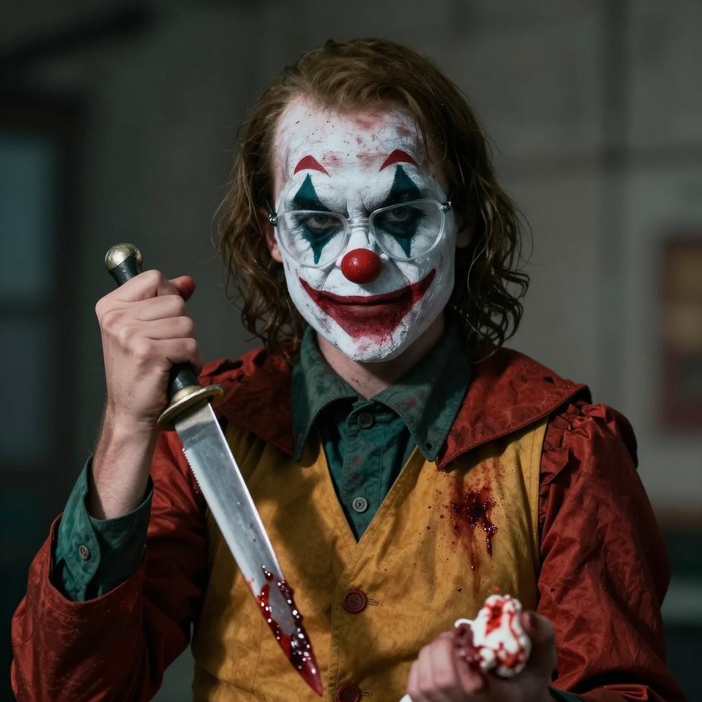 A person with long brown hair, wearing a blood-stained clown costume and clear face mask with a red nose, holds a bloody knife in their right hand. Blood stains are visible on the costume and face. The person has a serious expression. The background is dark and blurred. The person's left hand holds a white, blood-stained object.