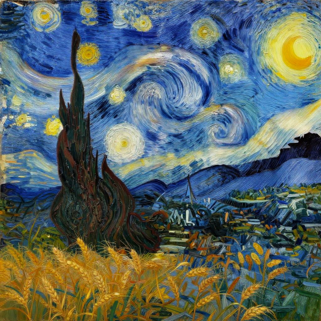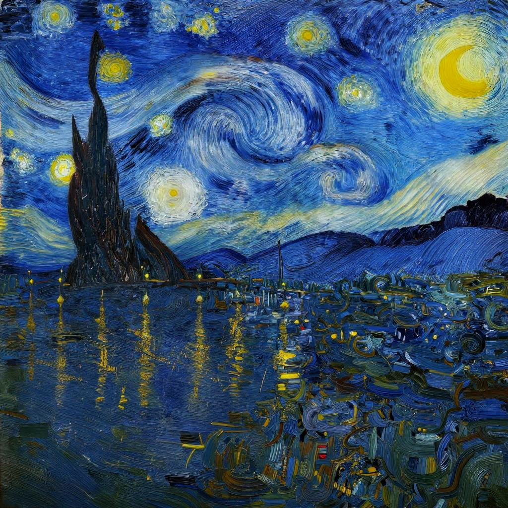 (Van Gogh style) view of an evening promenade along the River Thames, featuring couples walking hand in hand, historic buildings illuminated warmly, and lampposts casting elongated shadows on cobblestones. The scene is painted with expressive brushstrokes and rich, swirling textures characteristic of Van Gogh's style, bringing a sense of movement and energy to the night atmosphere. The color palette blends deep blues and warm yellows, capturing the intimate charm of London at night with a cozy, inviting ambiance. The composition emphasizes the lively yet tranquil mood of the city, transforming familiar streets into a dreamy, impressionistic vision.