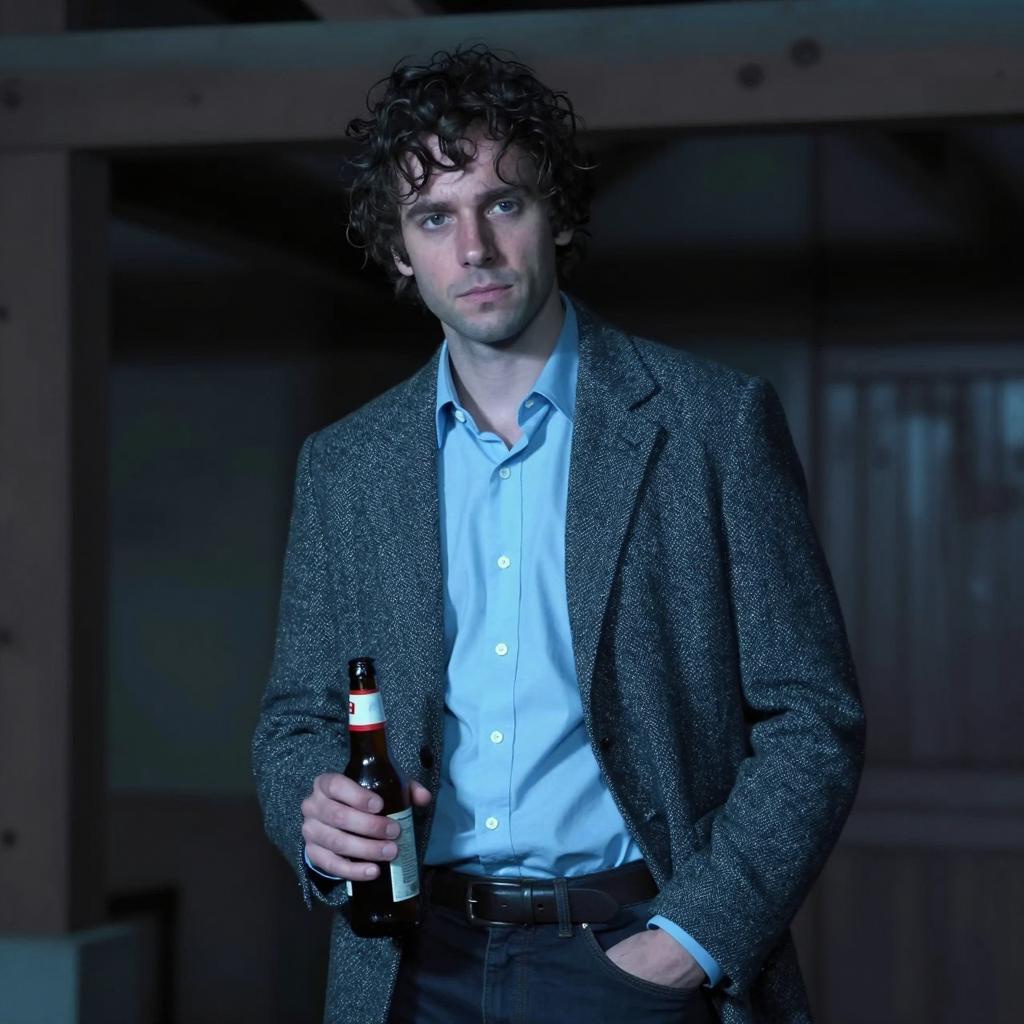 A man with wavy dark hair, wearing a light blue shirt and gray tweed jacket, standing in a dimly lit industrial setting. He holds a bottle in his right hand, left hand in pocket. Background includes wooden beams and dark shadows. Blue light illuminates his left side.
