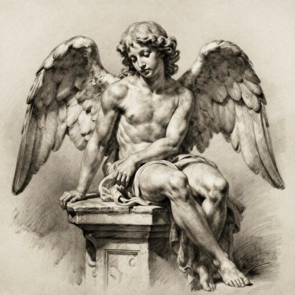 Angel drawing realistic, charcoal sketch capturing a peaceful angel resting on a stone pedestal, fine shading highlighting muscle tone and wing texture, subtle facial expressions radiating calm and grace, classical artistic style with dramatic contrasts and depth