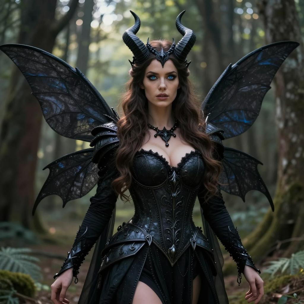 Woman evil fairy costume, digital art, fantasy character, female fairy, red wavy hair, green eyes, wearing dark green, elaborate lace corset with winged shoulders, large purple and pink iridescent wings, fairy wings detailed with fine lines and patterns, headband with small purple flowers, forest background, bokeh light effect, soft focus, enchanting, magical, realistic style, detailed ures, semi-realistic, high-quality, serene expression, close-up, centered, upper body shot