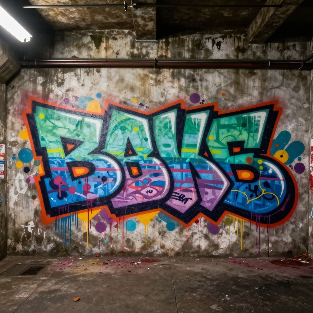 Blocky letters in vibrant neon colors, graffiti style on a textured urban wall, dynamic lighting, high contrast, digital art
