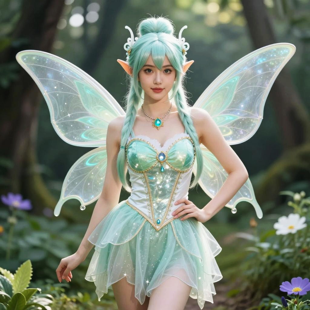 Portrait of a woman dressed in a sparkling mint green fairy costume, featuring iridescent wings, pointed elf ears, and an embellished corset with gemstone details. She has long mint green hair styled in braids and a high bun, standing in a lush forest setting with soft, natural lighting and vibrant flowers in the background.