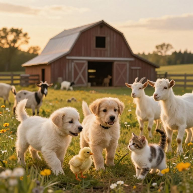 Animalitos on a countryside farm during golden hour, playful puppies, fluffy chicks, curious kittens, and smiling goats surrounded by rustic barn and wildflowers, warm light, painterly brushstrokes, nostalgic and heartwarming mood, realistic yet charming.