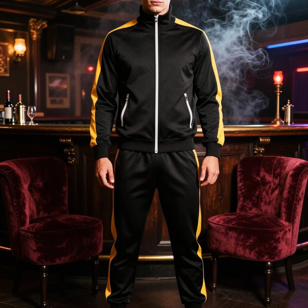 High contrast image of a mobster tracksuit in a smoky jazz club setting, velvet chairs and old wooden bar in the background, vibrant lighting highlighting fabric details, retro gangster fashion meets modern urban edge, mysterious and stylish atmosphere.