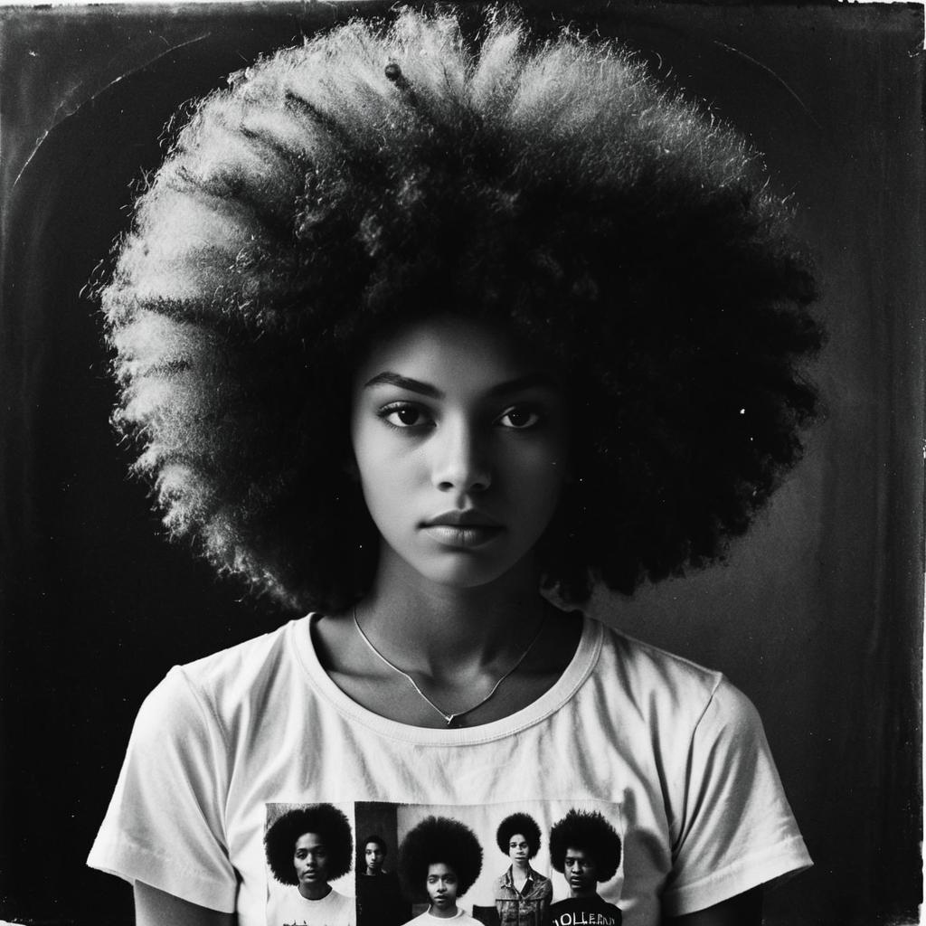 Monochrome close-up portrait of a young woman with long, thick braided hair styled into two braids. She has sharp facial features, a calm expression, and wears a dark, casual shirt. The background has an artistic, abstract texture, enhancing the dramatic effect of the image.