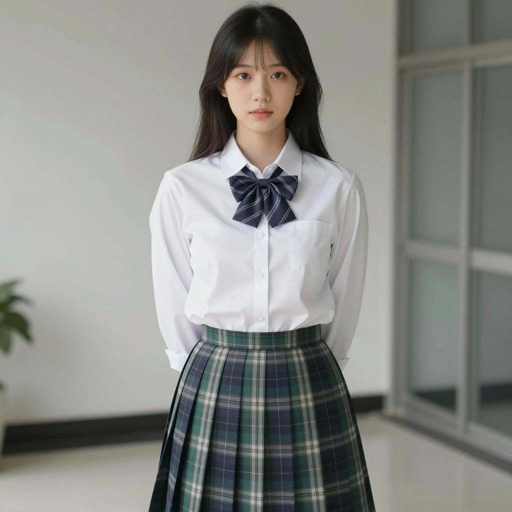 Japanese girl with long black hair, wearing white shirt with red bow, green plaid skirt, and black knee-high socks, sitting on wooden floor in front of window. Green foliage outside. Hands on lap, relaxed expression. "CKS×JAPAN" on right. Wooden chair in background. Natural light.