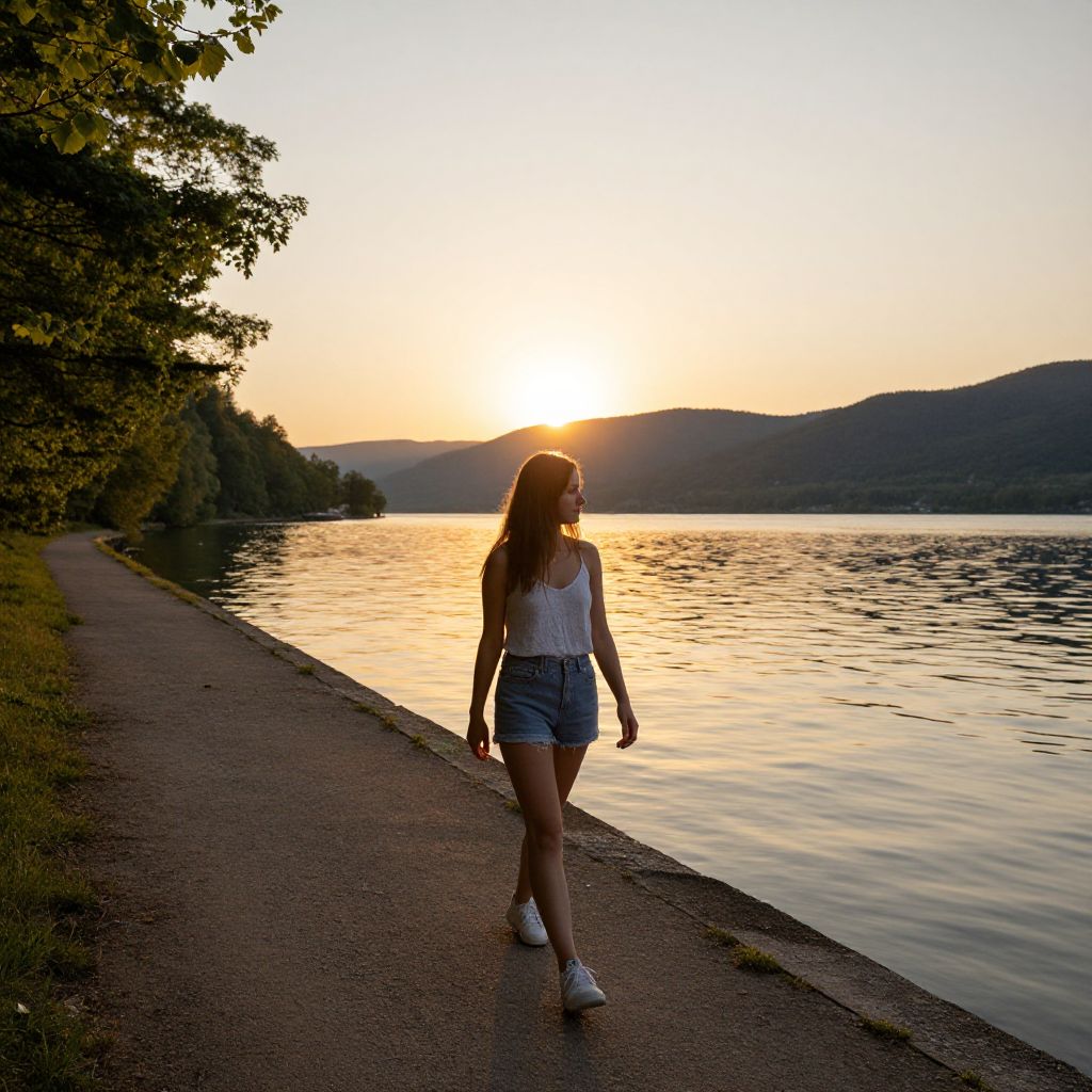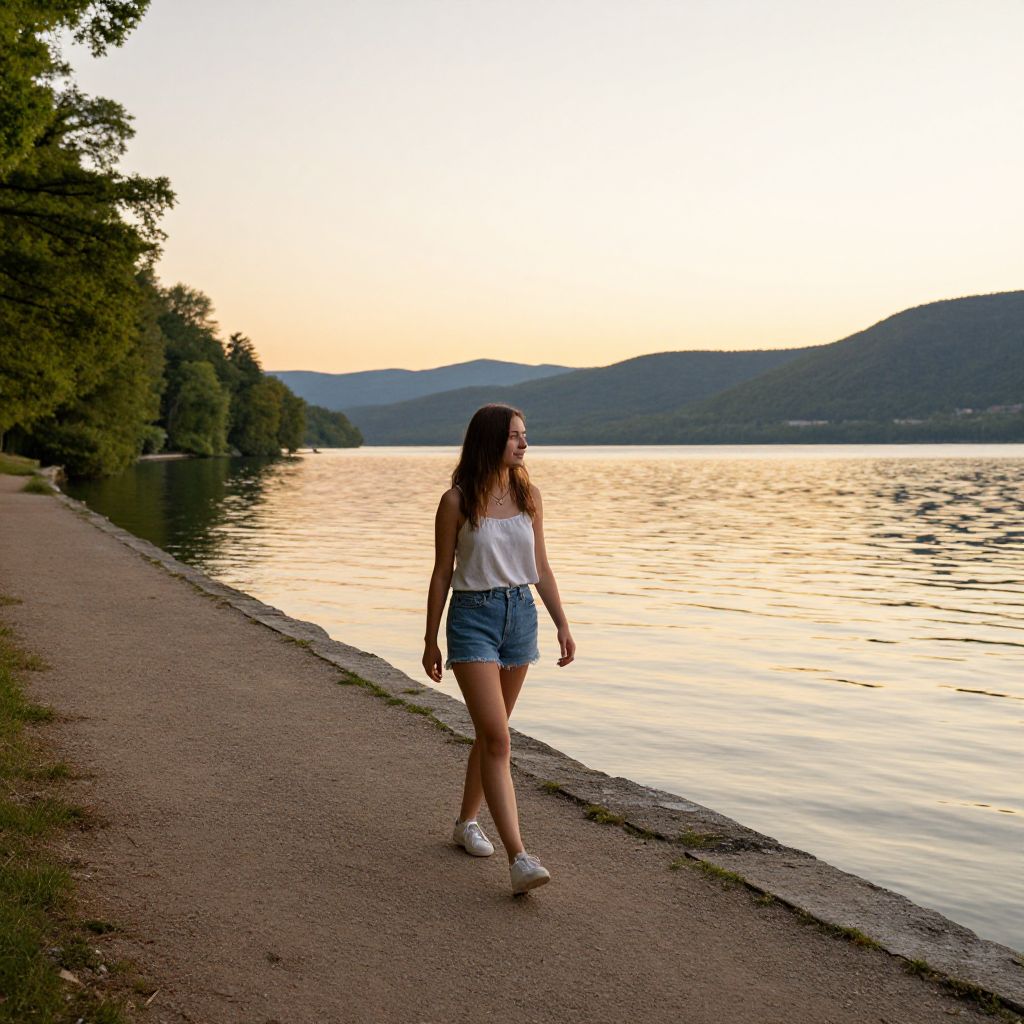 Photograph of a young woman with long brown hair, wearing a white tank top and denim shorts, walking along a lakeside path at sunset, with