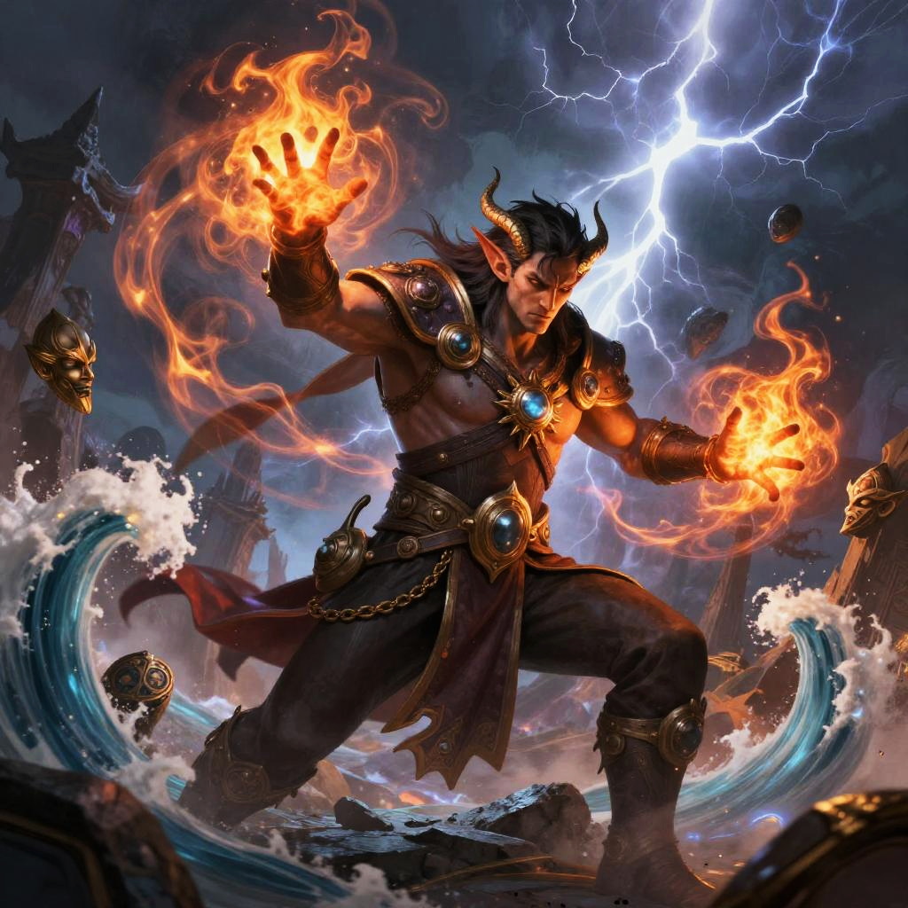 Dynamic scene of a genasi cleric mid-battle, summoning elemental forces with glowing hands, swirling flames and waves around them, ancient relics embedded in their armor, thunderous skies, magical energy radiating, high fantasy illustration