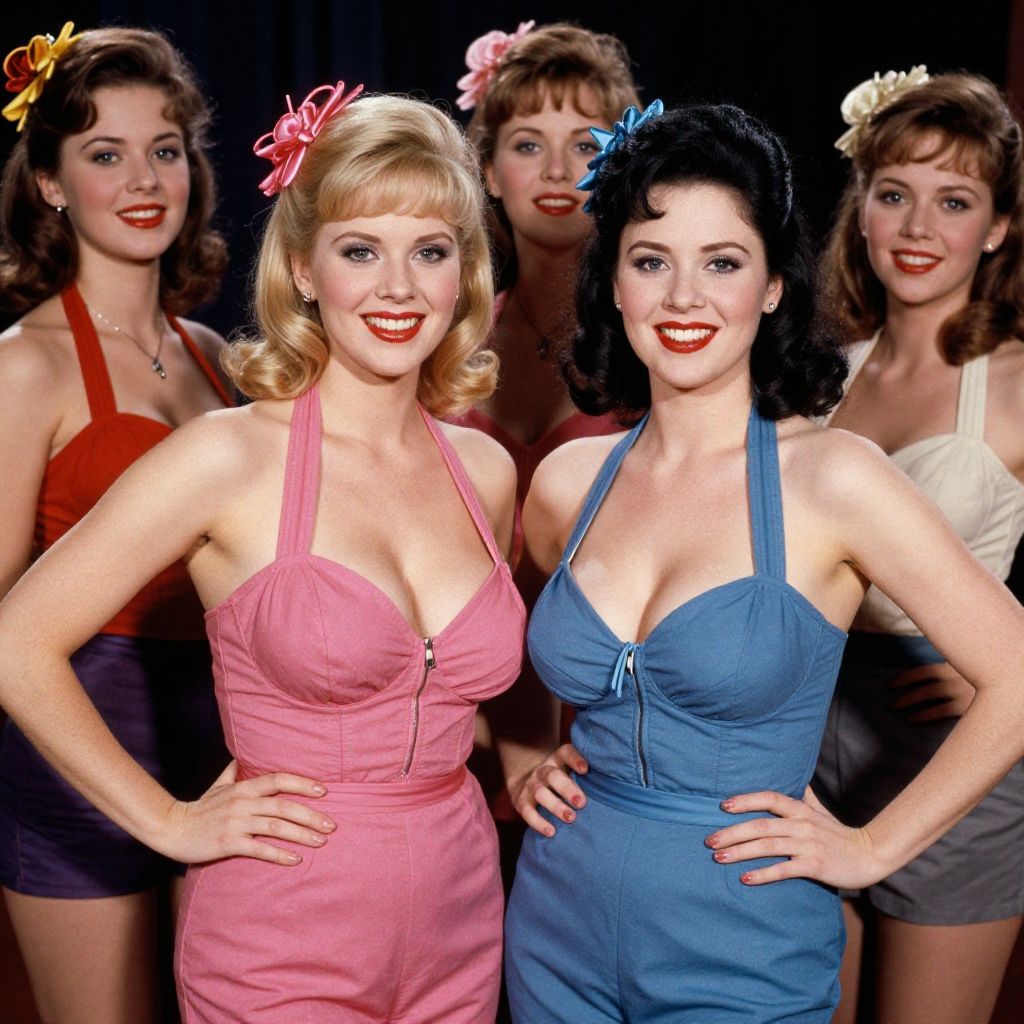 Score_9, score_8_up, score_7_up, score_6_up, score_5_up, score_4_up, score_7_up. Expressiveh, In the 1950's two women in costumes standing next to each other, looking at viewer, smile, multiple girls, blonde hair, brown hair, black hair, hair ornament, 2girls, upper body, teeth, lipstick, curly hair, realistic, red lips, vivid color, cinematic look, film look, filmic, contrast, detailed, high quality, sharp image, film color, Kodak, Motion Picture, Film style, different color, different people, different look, different style, Huge breasts, cleavage, narrow waist, wide hips, skinny, curvy, petite, female focus