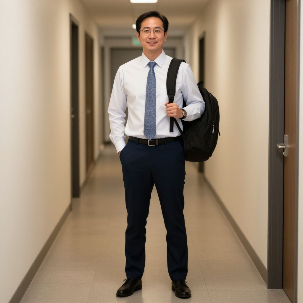 "Business Casual Lab Attire, man standing in a hallway with a backpack"