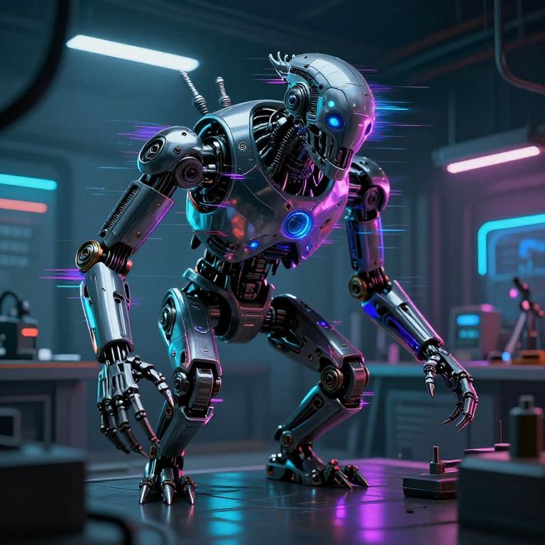 CGI image of a glowing, futuristic, metallic robot crouching in a neon-lit, high-tech lab, with vibrant blue, purple,