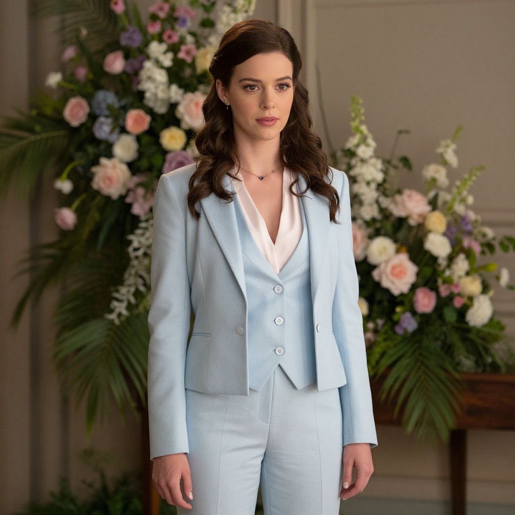 A digital photograph of a woman with long, wavy brown hair, wearing a light blue, tailored suit with a white blouse underneath. She stands confidently in front of a blurred floral arrangement featuring pink, white, and purple flowers with green foliage. The background includes a neutral-colored wall with subtle paneling. She has a fair skin tone, minimal makeup, and a small necklace. The image has a realistic CGI style, emphasizing professional and elegant aesthetics.