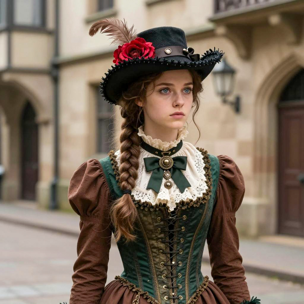 Lady luck costume, photograph of young woman with long red braided hair, wearing green patterned Victorian dress with puffed sleeves, lace trim, and straw hat with green ribbon, standing outdoors in autumn, blurred market background, man in dark coat walking in background, sunlight casting shadows, realistic style, natural light, shallow depth of field